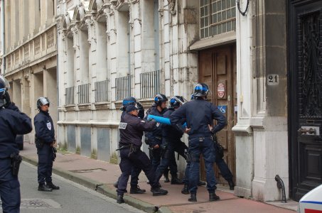 Attaque à 15 heures en force du bâtiment : Police nationale, Police aux frontières, OPH. Plus de 10 véhicules de police bloquent la rue. Nous sommes repoussés aux deux extrémités de la rue avec violence, certains policiers sortant leur matraque et bombe lacrymo. La police défonce la porte avec un bélier, les deux occupants se font arrêter violemment.