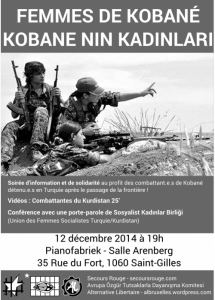 En association avec l’Union des Femmes Socialistes (Turquie/Kurdistan) et le Collectif Alternative Libertaire de Bruxelles, le Secours Rouge organisera ce vendredi 12 décembre une soirée de soutien et d’information sur les combattantes et combattants kurdes à Kobané. Un court documentaire de 25 minutes au sujet des brigades de femmes combattantes (YPJ - Unités de Protection des Jeunes) sera projeté et une conférence/débat aura ensuite lieu avec une porte-parole de l’Union des Femmes Socialistes (Sosyalist Kadınlar Birliği). Les fonds récoltés seront reversés au profit de combattant.e.s enfermé.e.s en Turquie alors qu’ils passaient la frontière entre la Syrie et la Turquie.